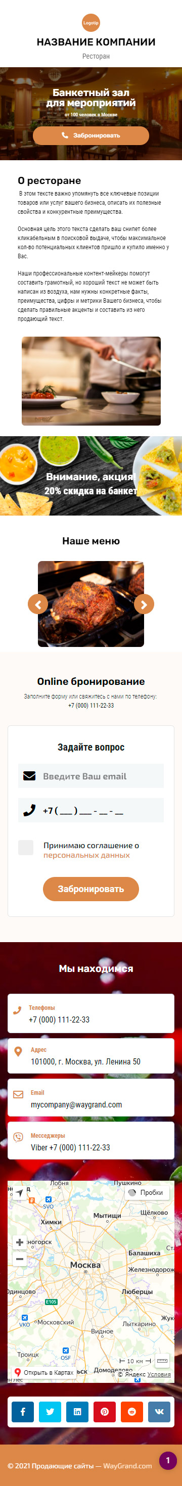 - Промоблок "Банкетный зал" с кнопкой призыва к действию "Забронировать"