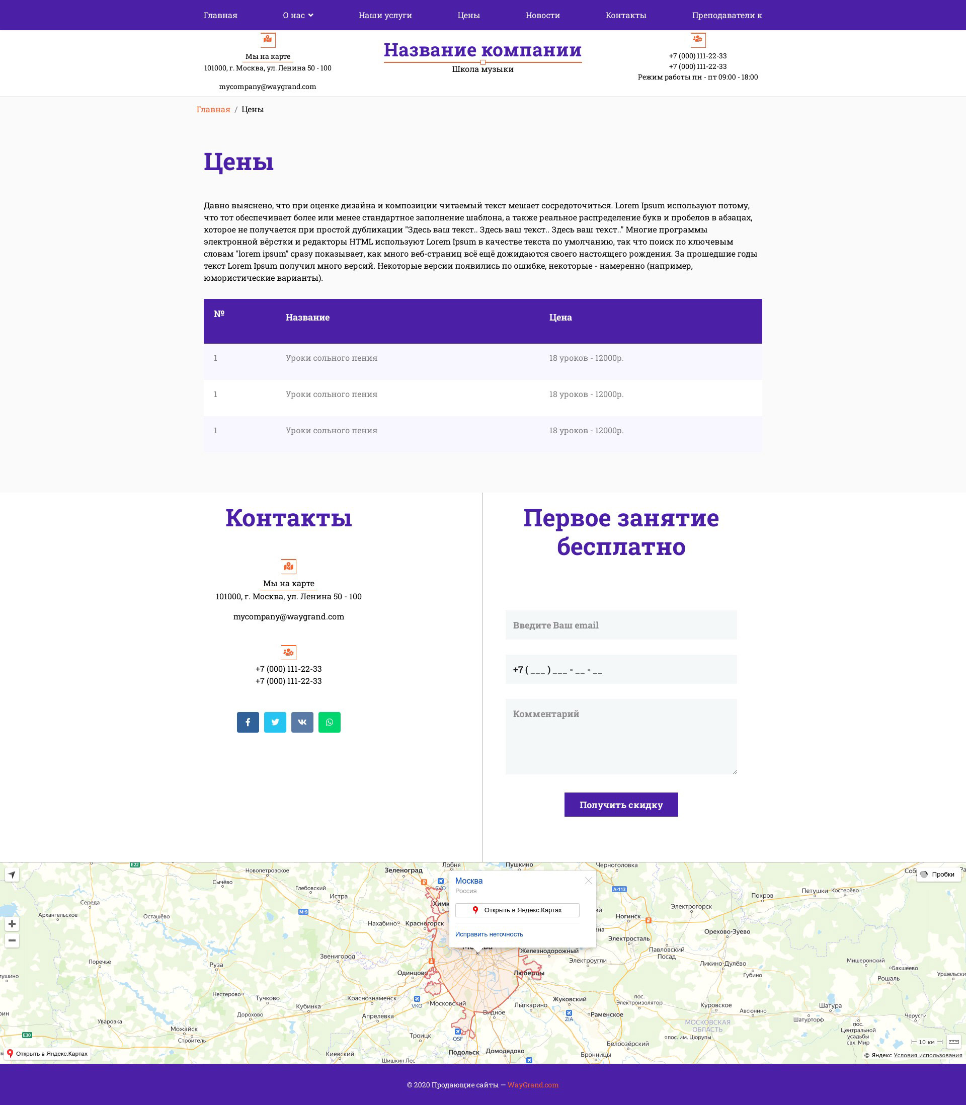 - Блок "Контакты" и форма "Первое занятие бесплатно"