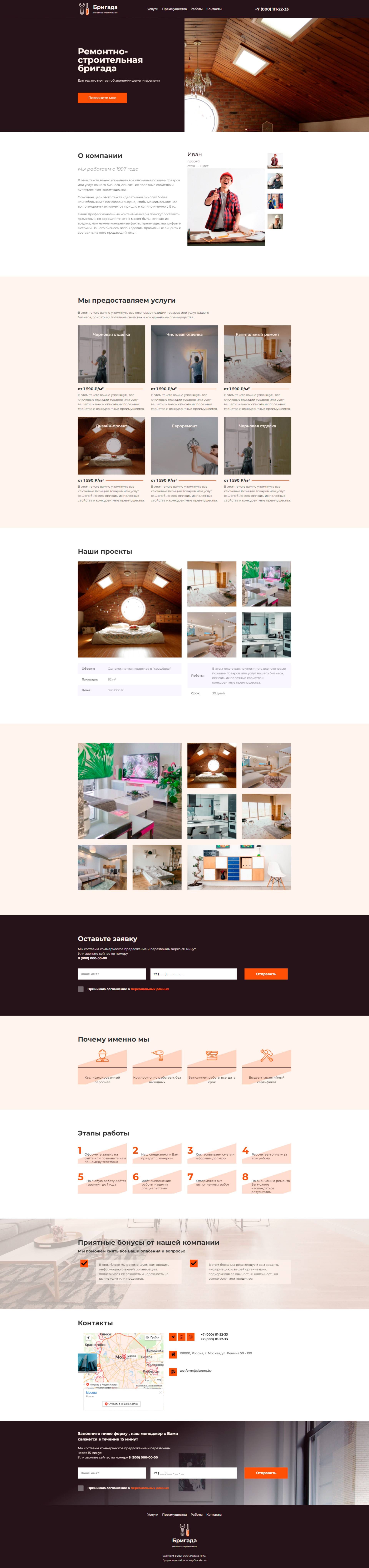 - Промоблок "Ремонтно-строительная бригада" с кнопкой призыва к действию "Позвоните мне"