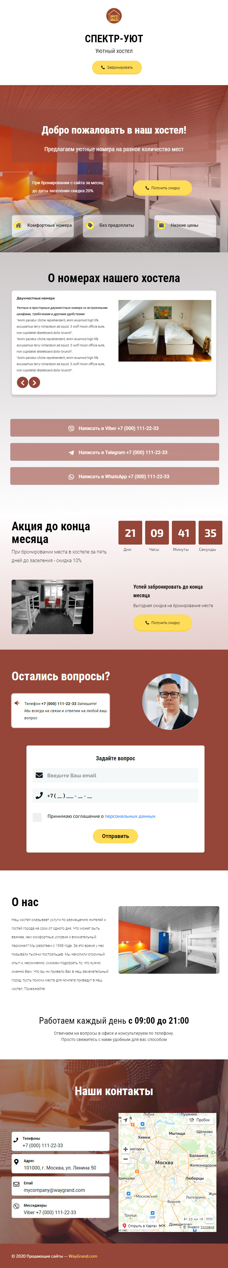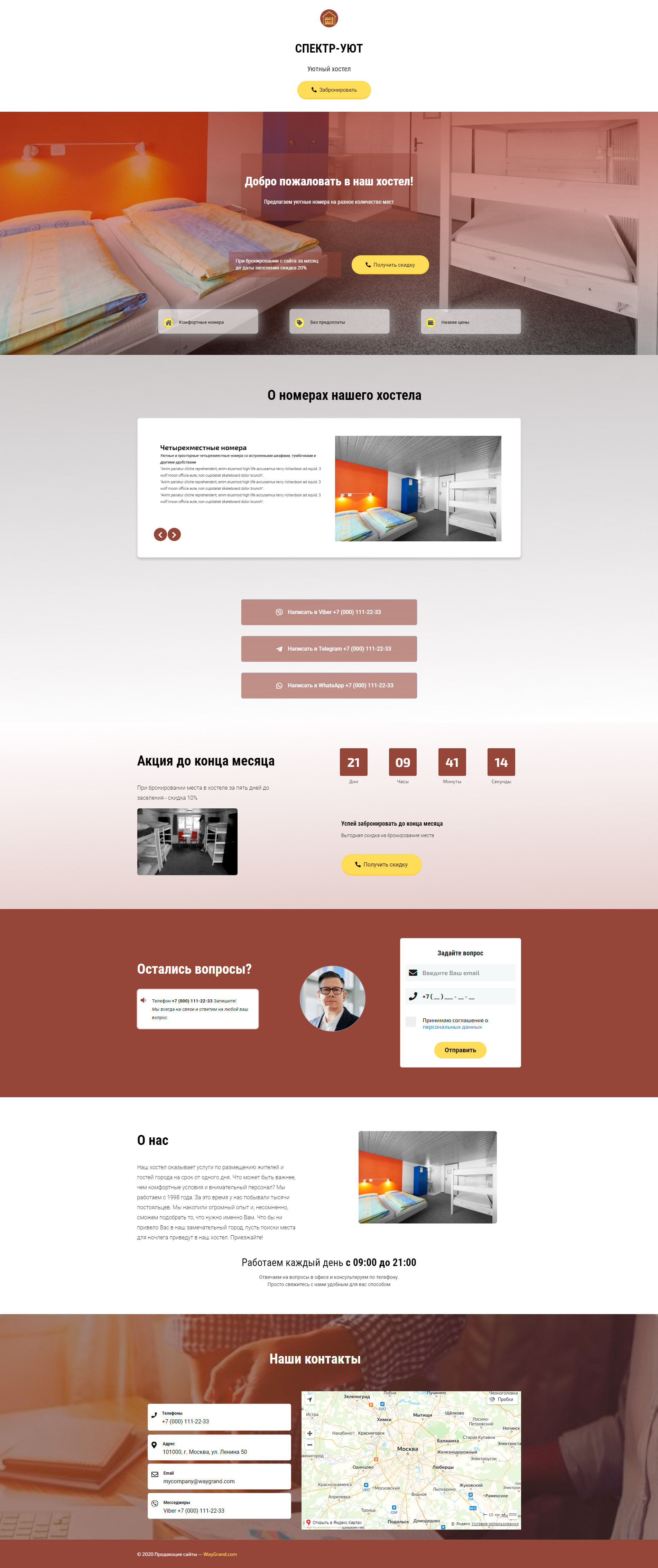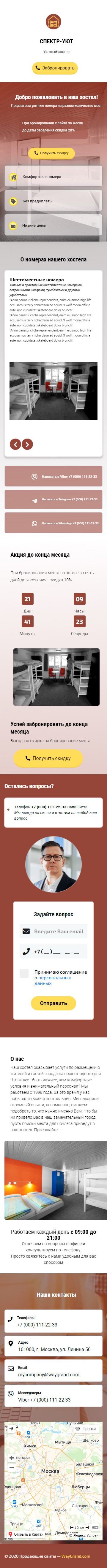 - Промоблок "Добро пожаловать в наш хостел!" с кнопкой призыва к действию "Получить скидку"