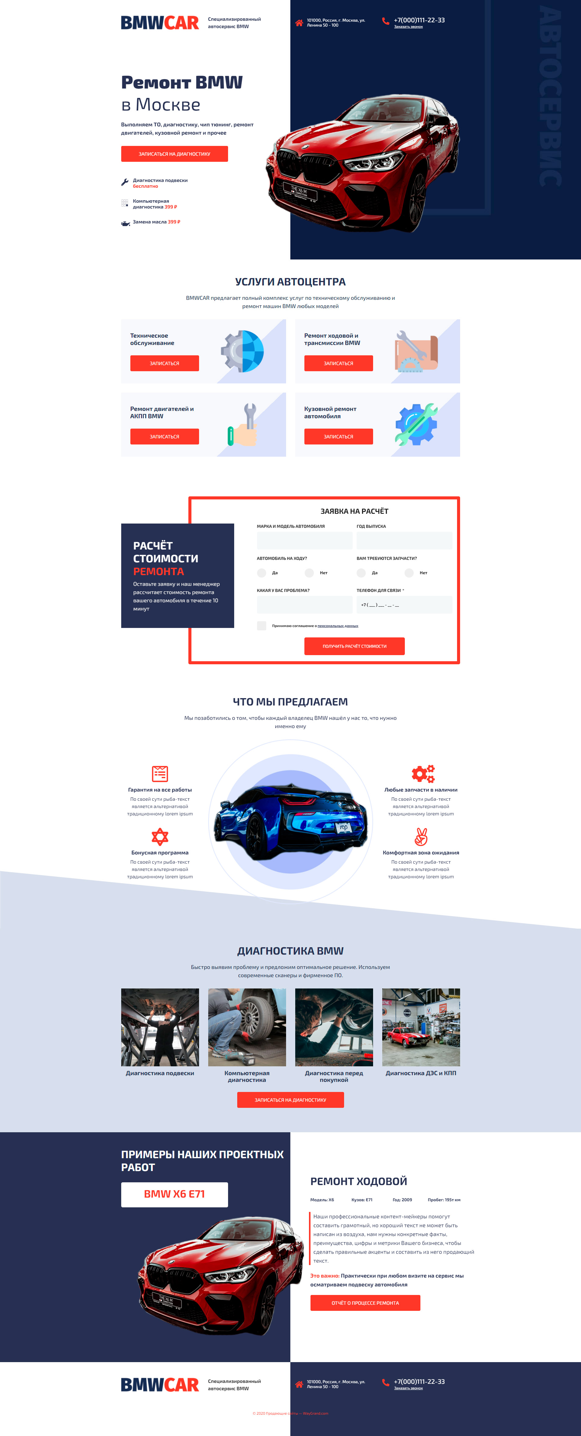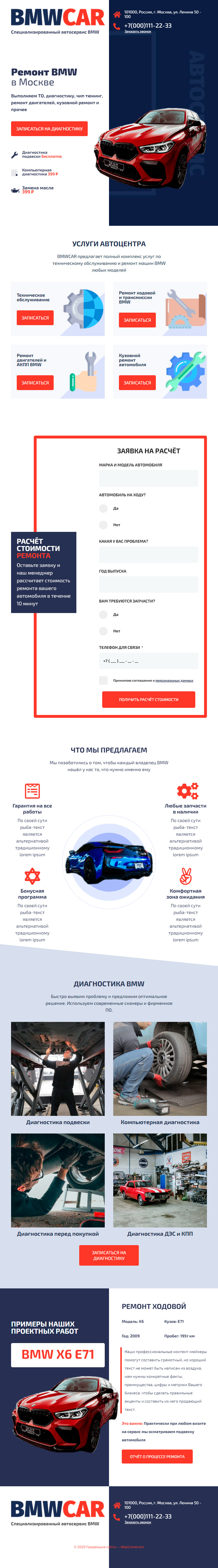 - Промоблок "Ремонт BMW в Москве" с кнопкой призыва к действию "Записаться на диагностику"