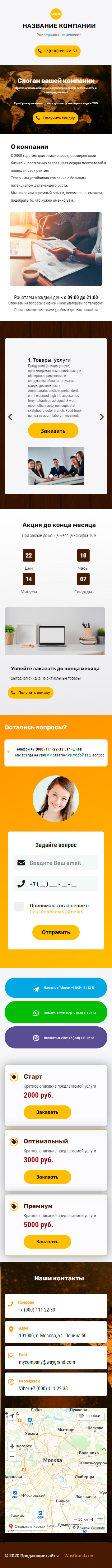 - Промоблок "Слоган вашей компании" с кнопкой призыва к действию "Получить скидку"